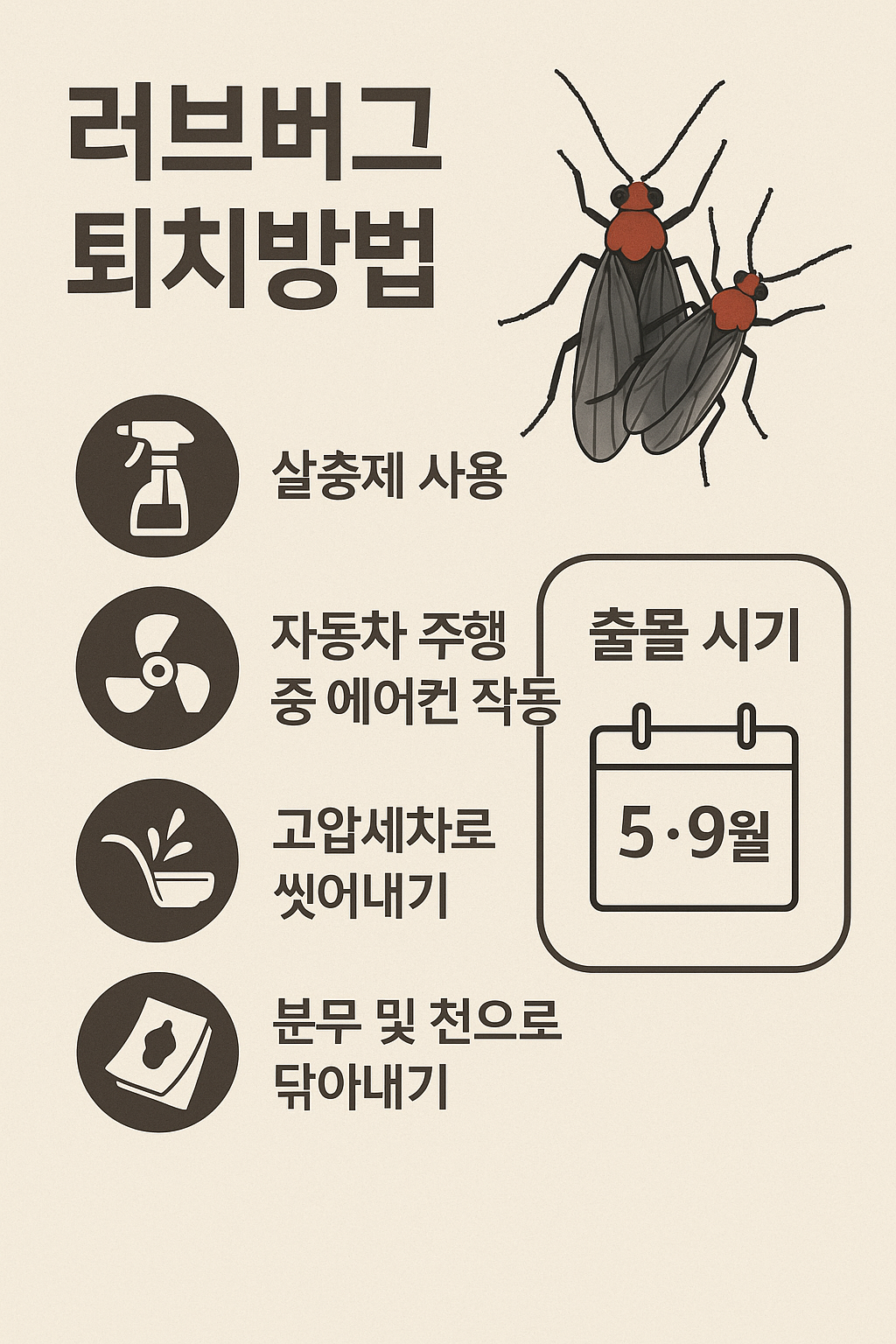 – 러브버그는 빛에 매우 민감하므로, 야간 조명은 가급적 줄이는 것이 좋습니다. - 방충망·문단속 점검